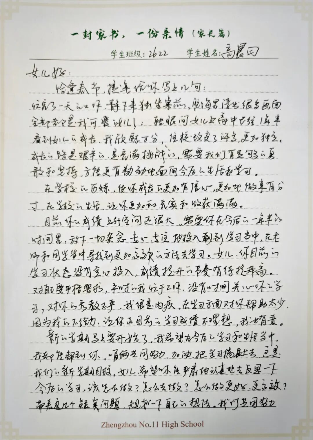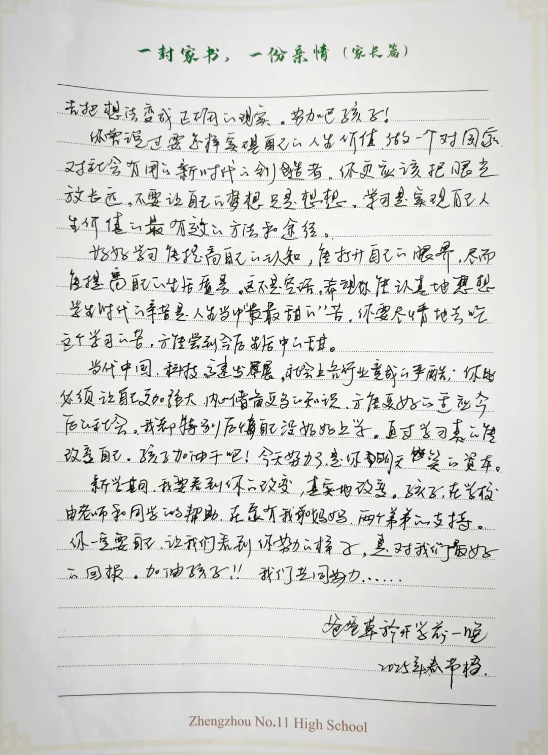 恰逢春节,提笔给你写上几句,忙完了一天的工作,静下来独坐桌前,脑海里浮出很多画面,全部都是我可爱的女儿。转眼间女儿上高中已经一年半了,看到女儿的成长我欣慰万分,你住校后改变了许多,更加独立。成长的路是艰辛的,是充满挑战的,需要我们有足够的勇敢和坚持,方能更有韧劲的面向今后的生活和学习。