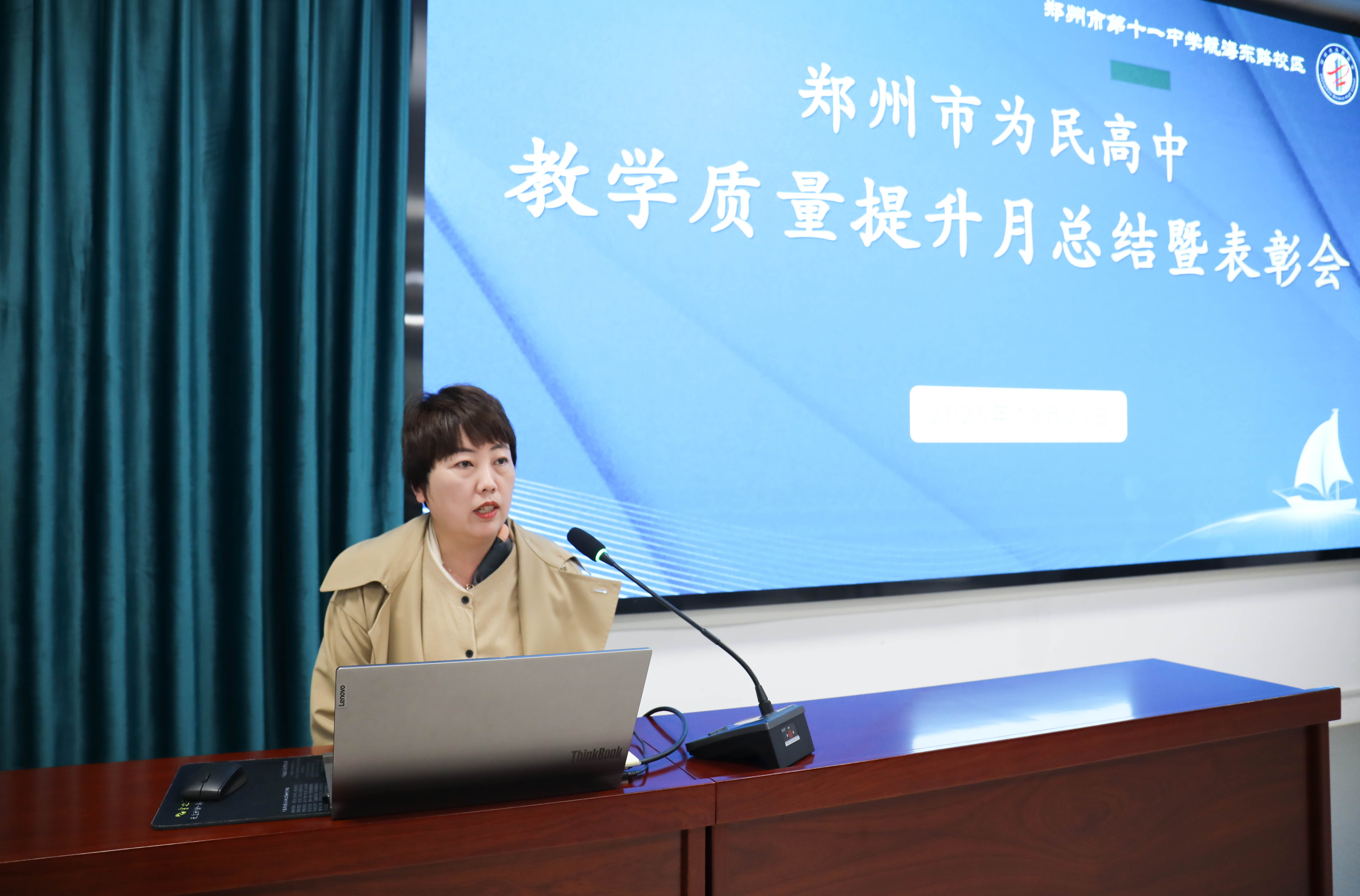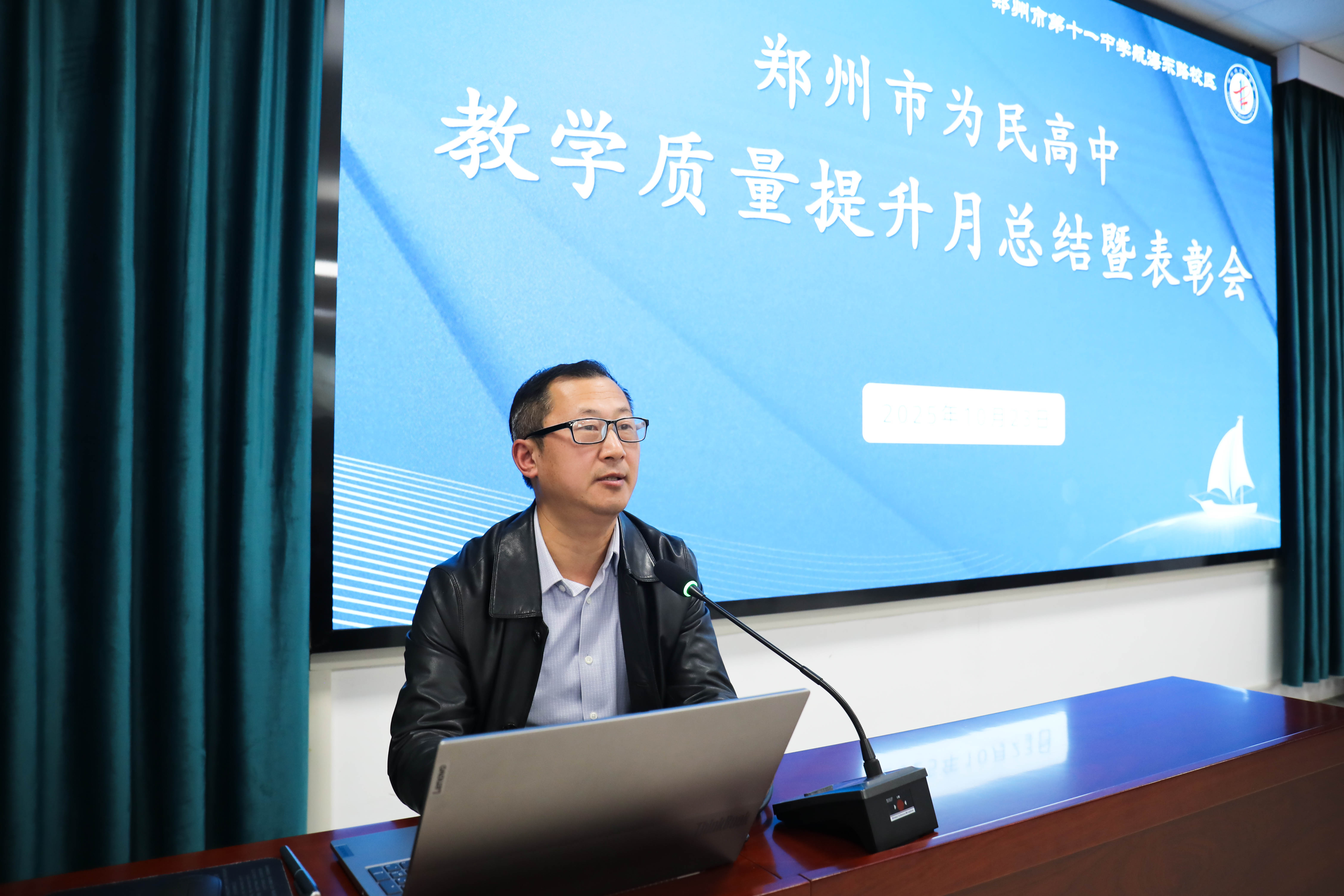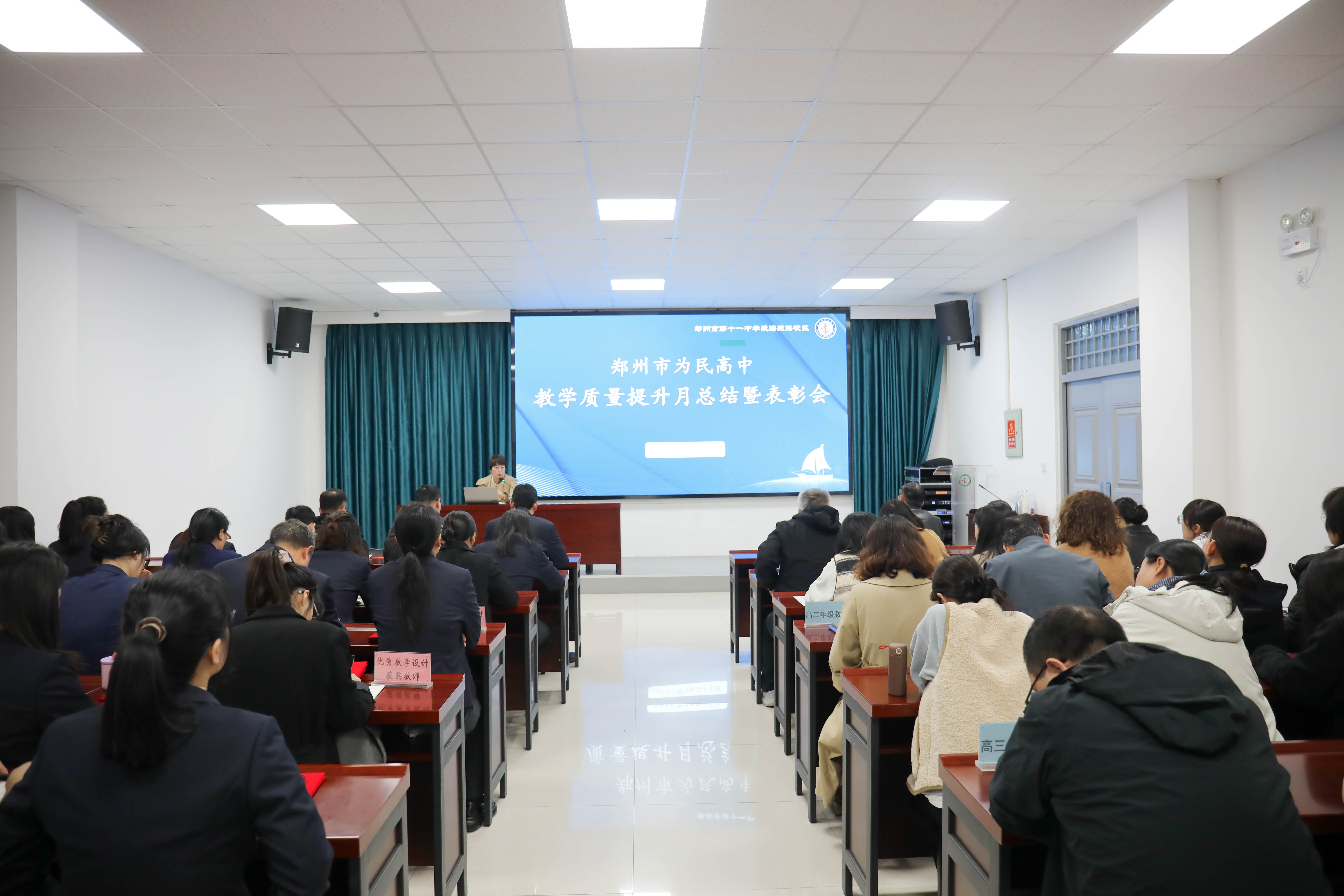 郑州市为民高中执行校长王书喜宣读《郑州市为民高中教学质量活动月表彰决定》,明确表彰标准与意义。学校领导为获奖教师颁奖并合影留念。