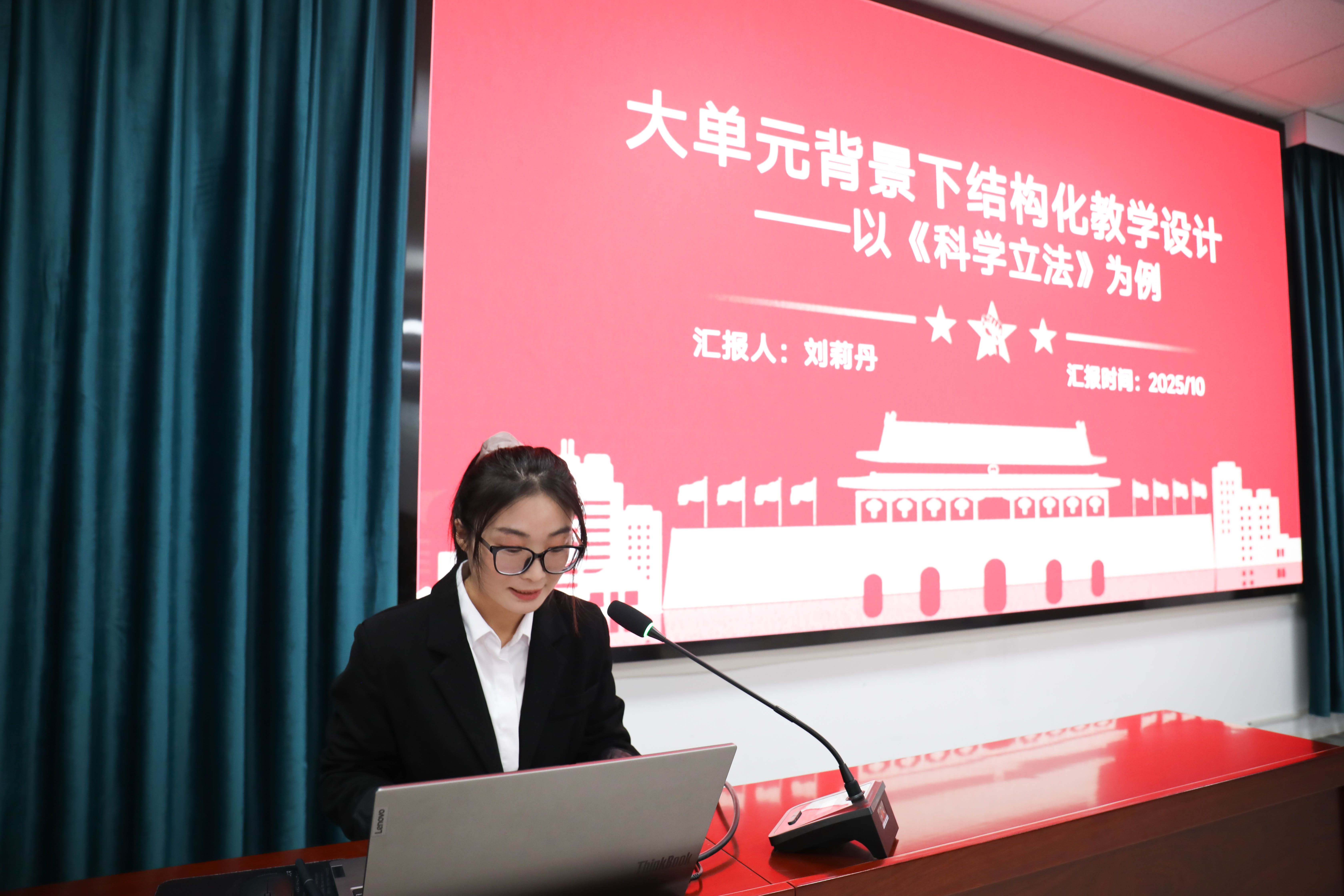 青年教师刘莉丹老师以《大单元背景下结构化教学设计——以〈科学立法〉为例》为题,深度剖析传统教学中“知识散点化、素养悬浮化、认知浅表化”的“三散困境”,提出以“大单元结构化教学”为破解钥匙设计 “三维路径”,通过“材料分析评价、模拟表现评价、过程性观察评价”的教学评一体化设计,确保核心素养真正落地,为大单元教学的实践提供了清晰的操作框架。