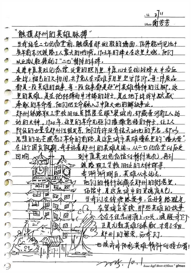 国庆期间,学生们以小组为单位,踏上寻访家乡英雄的实践之旅。他们走进二七纪念堂,聆听京汉铁路工人运动的壮烈史诗;驻足碧沙岗公园,感受北伐将士的忠魂浩气;探访中原英烈纪念馆,追寻革命先辈的奋斗足迹。从吉鸿昌的慷慨就义到杨靖宇的林海雪原,从焦裕禄的兰考丰碑到任长霞的警界传奇,一个个曾经遥远的名字,在实地寻访中变得真切可感。