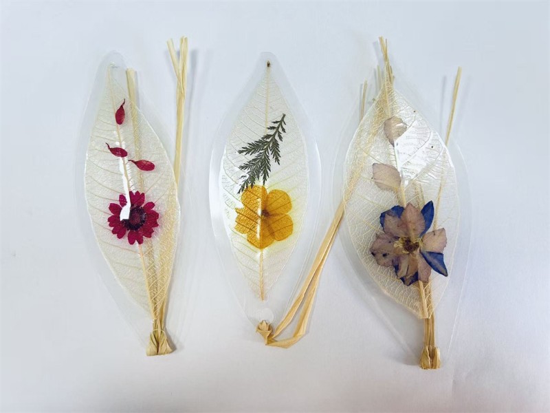 活动伊始,教师通过8分钟微课,帮助学生回顾纤维素与木质素的相关知识,并重点强调实验安全规范。随后,各班学生分组进入实验区,在教师指导下进行叶脉书签制作。实验过程中,同学们将预处理过的叶片置于玻璃片上,用软毛牙刷沿特定角度轻刷叶肉,并学习运用“水刀”技巧清理叶脉细节。漂白阶段,师生共同控制漂白液pH值,使叶脉逐渐变得透明。在硬化与染色环节,同学们发挥创意,调配颜色、绘制图案,并借助滴胶与热风枪完成封装。高二1班赵同学利用群青与湖蓝调出“黄河之水天上来”的渐变效果,引来周围师生赞叹。在收尾阶段,教师指导学生进行流苏装配与真空压膜,最终完成二百余枚风格各异、耐折耐水的叶脉书签。高二2班张同学在活动后表示:“原来氢氧化钠不仅能用于皂化反应,还能创造出如此精美的叶脉艺术品!”