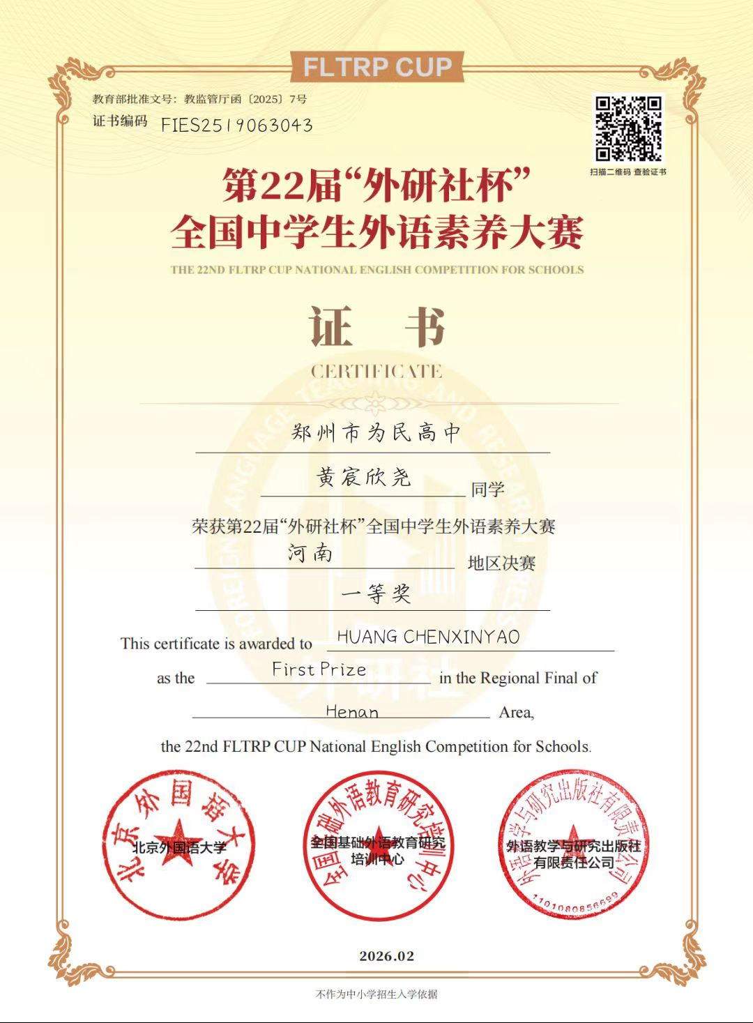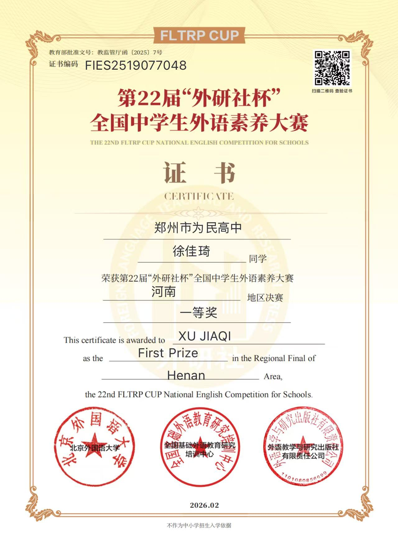 【喜报】 郑州市为民高中学子在第22届“外研社杯”全国中学生外语素养大赛中斩获佳绩