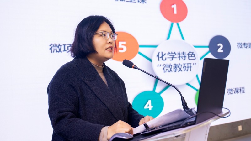在特色教学展示环节,化学教研组长敬小娟老师作《以微见大,多维立体打造校本教研新样态》专题分享。她围绕“微教研体系建设、多维立体教研实施、教研成果转化辐射、学科素养融合实践”四个方面,系统阐释了化学组校本教研的创新路径与实践成效。她从“微型课、微专题、微课程、微课题、微项目”五大微教研模块的落地,到真实问题情境教研、高考主题教研等四维立体架构的搭建,再到学科特色活动开展、教研公众号运营等成果推广,全面展现了化学组推动教研从经验走向科学、从零散走向系统的深度探索。