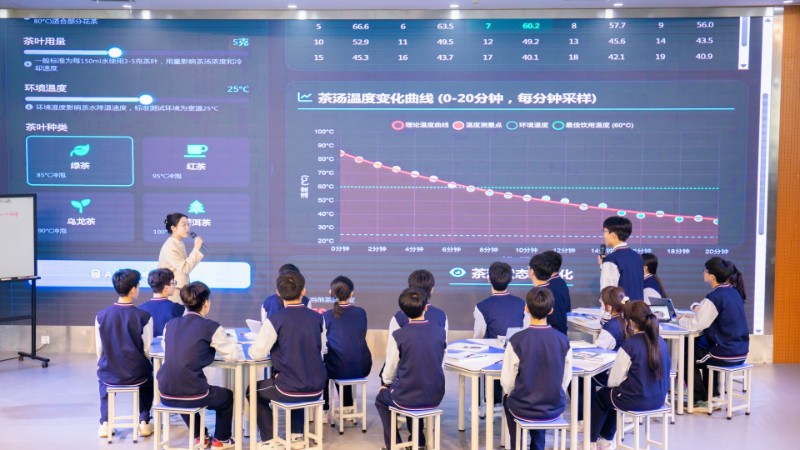 数学教师邵一鸣执教《AI建立函数模型解决实际问题——以探究“茶水冷却之律”为例》一课,AI助教“小智”全程陪伴,提供实验数据、生成动态散点图、支持模型验证与误差分析。学生以小组合作形式,在 AI 的专业辅助下,完整经历问题提出、数据收集、模型构建至检验优化的数学建模全流程,真切感悟到数学与现实生活的深度联结。这堂 AI 与数学建模深度融合的课堂,有效破解了传统教学中工具单一、大数据分析难度大的教学痛点,既为学生预留了更充分的自主探究空间,更着力培养了学生运用数学思维驾驭技术工具的核心能力。